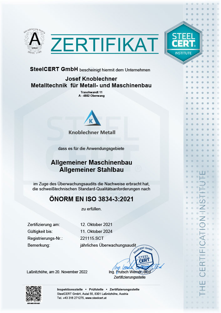 Wir führen die Schweißaufsicht nach EN ISO 14731 – ZFP (zerstörungsfreie Prüfung der Schweißnähte) durch. Bei Knoblechner Metalltechnik in Oberwang im Bezirk Vöcklabruck arbeitet ein motiviertes Team mit Sorgfalt und Erfahrung an Ihren Aufträgen für Lohnschweißen. Wir stellen uns individuell auf Ihre Anforderungen ein.
